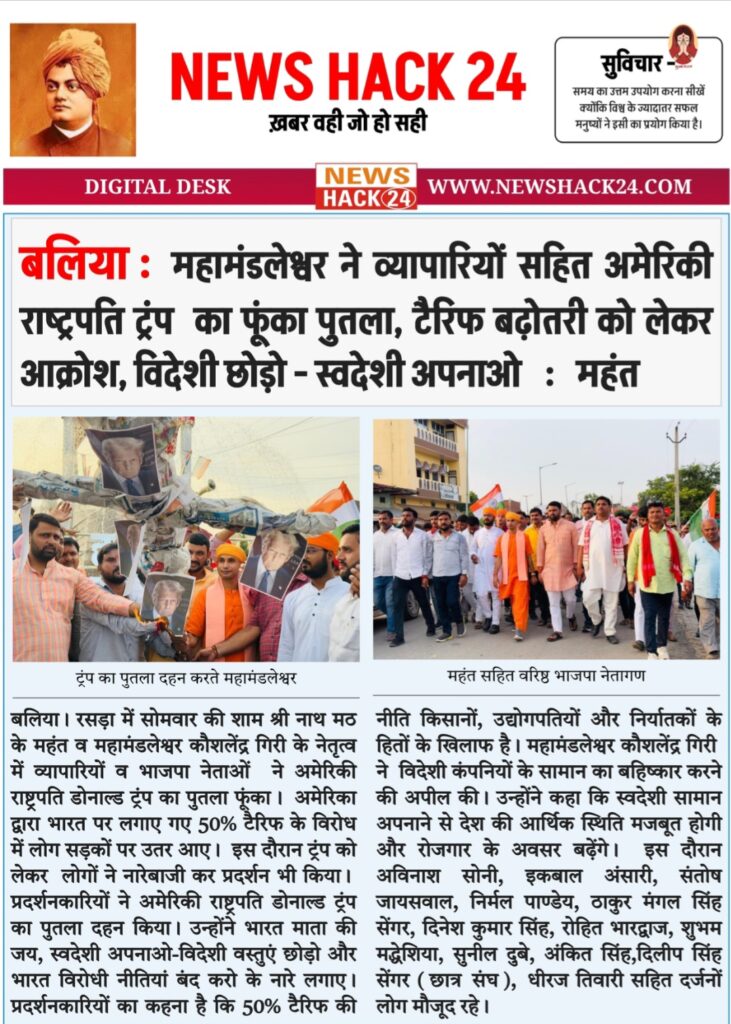 बलिया। रसड़ा में सोमवार की शाम श्री नाथ मठ के महंत व महामंडलेश्वर कौशलेंद्र गिरी के नेतृत्व में व्यापारियों व भाजपा नेताओं ने अमेरिकी राष्ट्रपति डोनाल्ड ट्रंप का पुतला फूंका ।